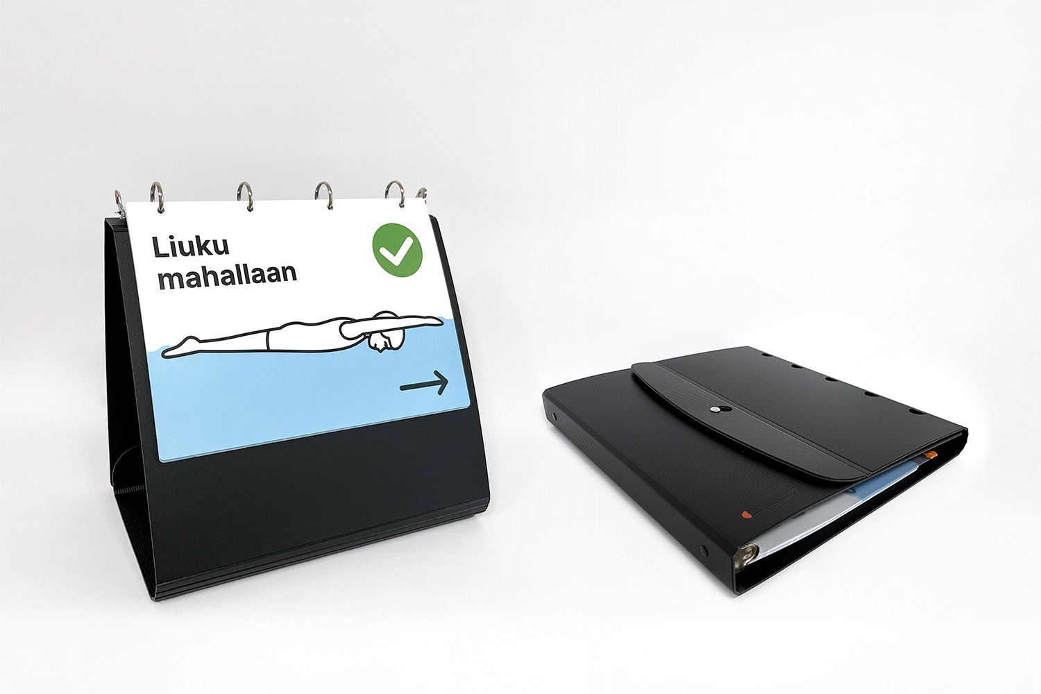 Uintikortit ovat saatavilla pystyyn taitettavassa kansiossa ja helposti mukana kulkevassa kaulanauhassa. Kansio sopii ryhmäopetukseen altaan laidalle, ja kaulanauha taas yksilölliseen ohjaukseen. Molemmat sisältävät 15 vedenkestävää korttia. Käyttövalmiit ja kestävät kortit on helppo ottaa osaksi uimaopetusta.